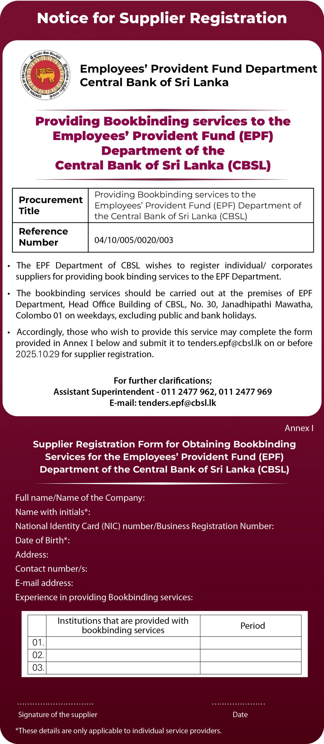 Procurement for Supply and Delivery of Printers, Photocopiers and other Office Equipment for Employees’ Provident Fund Department of Central Bank of Sri Lanka Tender Notice Download Bidding Documents Download